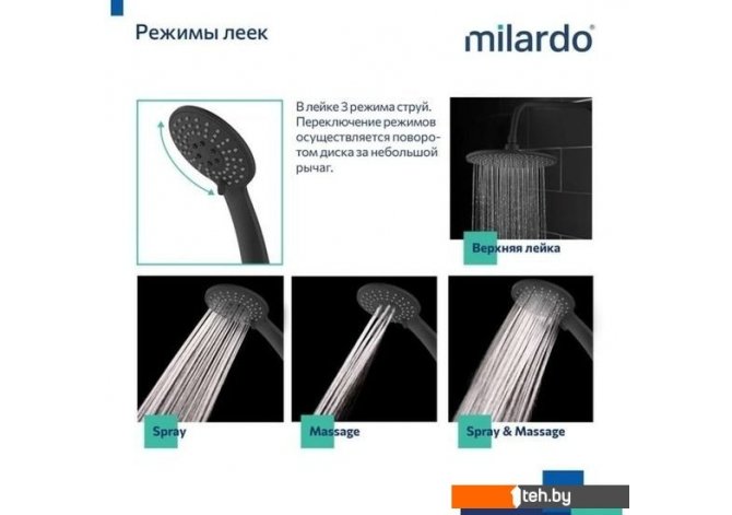 | Комплектация | верхний душ, штанга, ручной душ (лейка), держатель лейки, шланг, смеситель, излив для ванны |