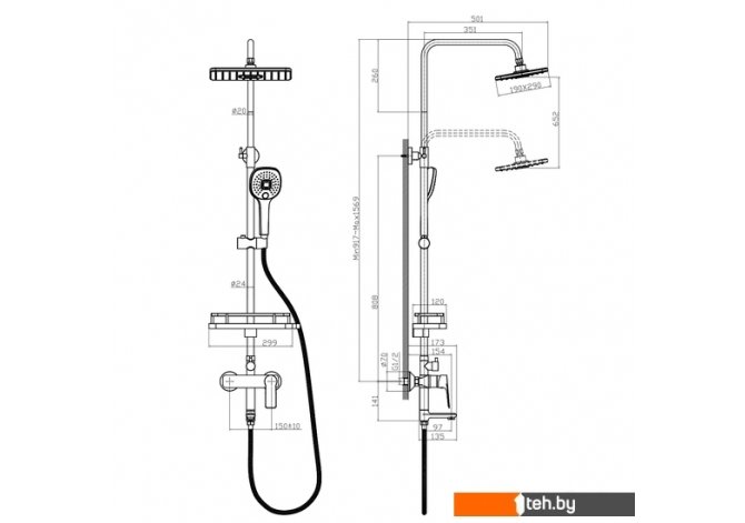 | Комплектация | верхний душ, штанга, ручной душ (лейка), держатель лейки, шланг, смеситель, излив для ванны, полочки |
