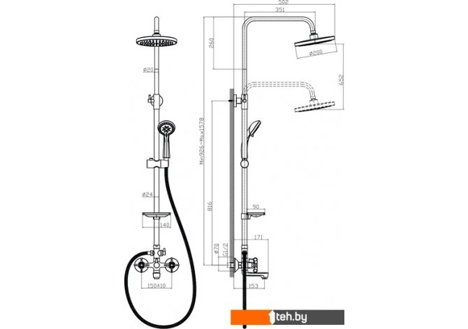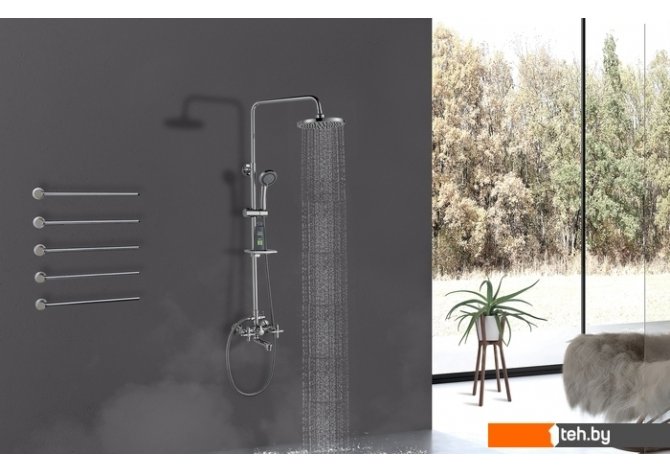 | Комплектация | верхний душ, штанга, ручной душ (лейка), держатель лейки, шланг, смеситель, излив для ванны, мыльница или держатель для мыла |