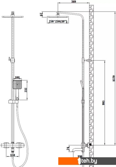 Комплектация | верхний душ, штанга, ручной душ (лейка), держатель лейки, шланг, смеситель, излив для ванны |