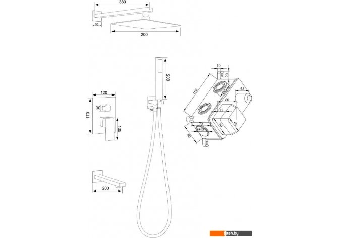 | Комплектация | верхний душ, ручной душ (лейка), держатель лейки, шланг, смеситель |