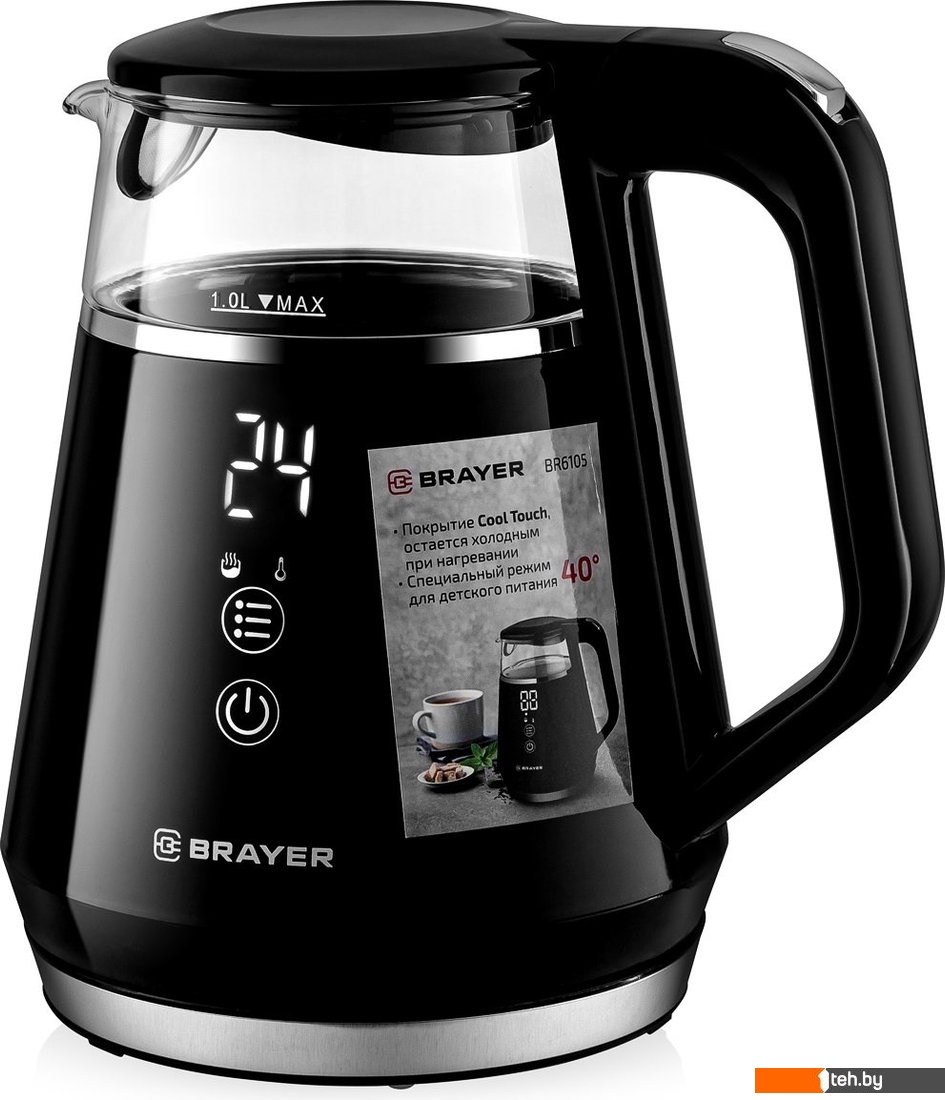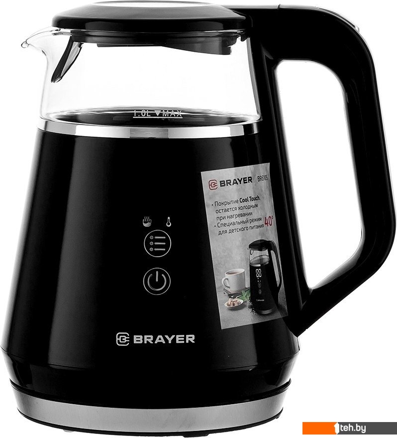 Информация | - Максимальная мощность составляет 1100 Вт, а объём — 1 литр. - Удобное сенсорное управление. Корпус выполнен из высокопрочного термостойкого стекла с пластиковым покрытием Cool Touch, которое остаётся холодным даже при нагревании. - Функции кипячения и подогрева воды позволяют выбрать оптимальную температуру для разных сортов чая (от 40 до 100°С). - Возможность поддержания заданной температуры в течение 2 часов. - Автоматическое отключение при закипании воды и при отсутствии воды. |