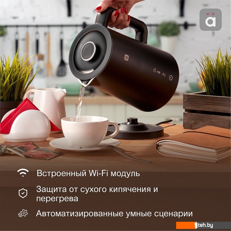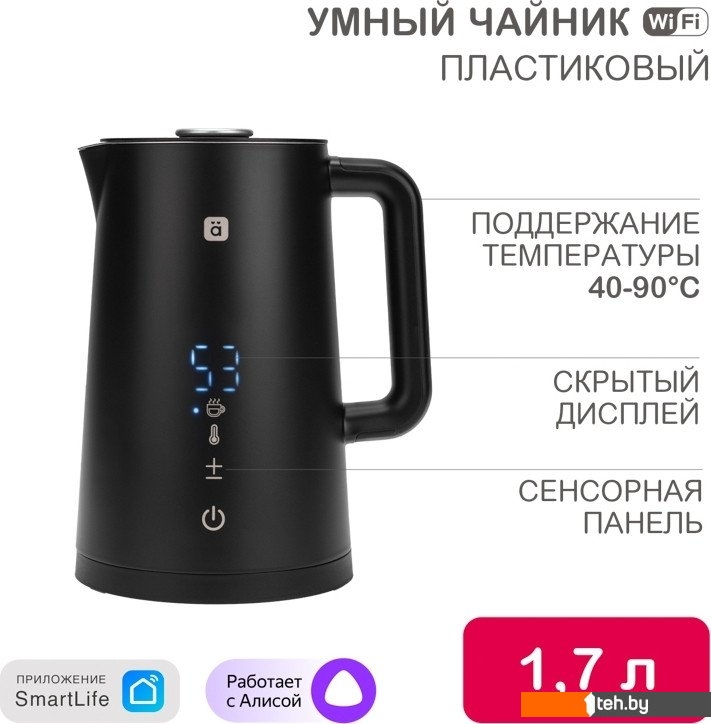 Информация | - Электрический чайник Halsa HLS-K-103 предназначен для быстрого нагрева и кипячения воды. - Благодаря возможности подключения к сети Wi-Fi вы можете включать чайник с помощью смартфона и настраивать температурные режимы дистанционно. - Прибор может использоваться самостоятельно, а также совместно с другими устройствами интеллектуальной системы «Умный дом» и принимать участие в автоматизированных умных сценариях. - На корпусе располагается сенсорная панель с датчиком температуры воды для управления температурными режимами, подходящими для заваривания популярных видов чая и кофе, а также для приготовления детского питания. Предусмотрена поддержка тепла от 40 ? до 90 ?. - Устройство изготовлено из нержавеющей стали и пищевого пластика, легко отмывается от накипи и не выделяет вредных веществ при кипячении. - Чайник оснащен встроенной защитой от сухого кипячения, благодаря чему он не может включиться без воды и автоматически деактивируется при закипании. |