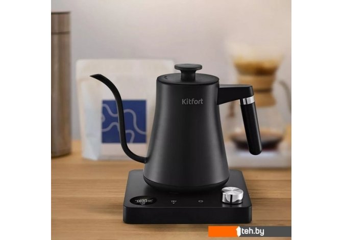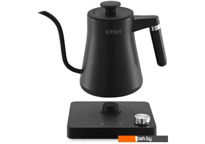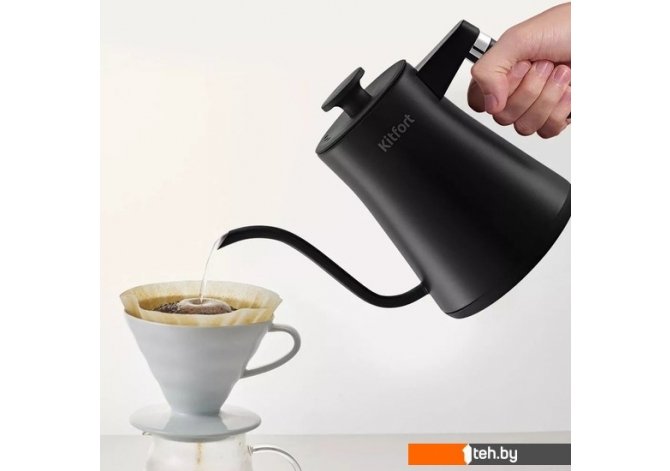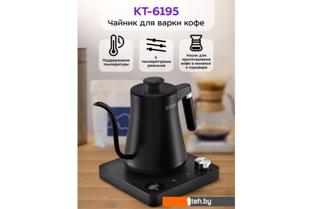 | Информация | ? Электрический чайник для варки кофе Kitfort КТ-6195 предназначен для кипячения и нагрева воды, а также приготовления кофе способами кемекс или пуровер. Чайник может нагреть от 40 до 100 °С, что очень удобно при приготовлении детского питания. ? Длинный изогнутый носик чайника формирует тонкий и ровный поток воды, что является обязательным условием для приготовления кофе в кемексе или пуровере. Благодаря тонкому носику вы сможете добиться равномерного процесса экстракции. ? Крышка и корпус чайника выполнены из нержавеющей стали, а подставка, ручки крышки и чайника — из пластика. Ручки чайника и крышки не нагреваются и удобно лежат в руке. На подставке расположена панель управления чайником и LED-дисплей. ? Регулятор служит для включения и отключения чайника, а также для выбора температуры нагрева от 40 до 100 °С с шагом 1 °С, режима и времени поддержания температуры. Нажатие на регулятор включает и отключает чайник. ? После нажатия на кнопку «Режим» вы можете выбрать режим, поворачивая регулятор: зелёный чай — 80 °С, белый чай — 85 °С, чай улун — 88 °С, кофе — 93 °С, чёрный чай — 100 °С. ? Вы можете установить функцию поддержания температуры, а также настраивать звуковые сигналы устройства. С помощью регулятора можно установить время таймера от 30 мин до 12 ч с шагом 30 мин. ? Подставка с центральным контактом дает возможность располагать на ней чайник в любом положении, обеспечивая вращение на 360°. Снизу имеется отсек для хранения шнура, в который можно смотать излишки шнура электропитания, чтобы он не мешал на столе. ? Полный чайник закипает за 5 минут. При закипании чайник автоматически отключится. Прибор имеет защиту от перегрева и от включения без воды: при включении без воды чайник нагревается и отключается. |