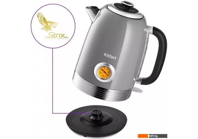 Информация | Чайник Kitfort КТ-6605 оснащён встроенным термометром, сделанным в винтажном стиле. Это очень удобно при заваривании напитков, для которых необходимо определённое значение температуры воды, например, зелёный чай, белый чай, кофе и т.д. Форма корпуса, стильный дизайн и оригинальное цветовое решение сделают чайник украшением вашей кухни! Корпус и крышка прибора выполнены из нержавеющей стали. Ручка пластиковая, не нагревается и удобно лежит в руке. За один раз в чайнике можно вскипятить до 1,7 л воды. Этого хватит, чтобы приготовить горячие напитки на большую семью! Мерная шкала позволяет легко следить за уровнем воды. В кнопку включения/выключения встроен индикатор нагрева. Специальная форма носика позволяет точно наливать воду в чашку без расплёскивания и брызг и быстро наполнять её. Крышка чайника полностью съёмная, что облегчает доступ внутрь чайника. Нагревательный элемент (ТЭН) в донной части закрыт пластиной из нержавеющей стали. Это препятствует образованию накипи, облегчает уход и значительно снижает шум при нагревании воды. В чайник встроен контроллер Strix, который занимает лидирующее положение среди поставщиков компонентов для электрочайников. Он позволяет предотвратить риски замыкания и возгорания и отключает работу при включении без воды. |