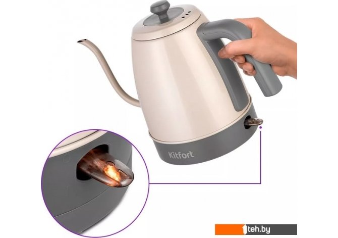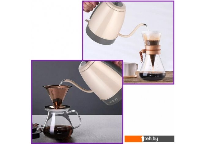 | Информация | ? Длинный носик формирует тонкий и ровный поток воды, что является важным условием для приготовления кофе в кемексе или пуровере. ? Корпус и крышка выполнены из нержавеющей стали и пластика. ? Ручка чайника пластиковая, не нагревается, удобно лежит в руке. ? Подставка с центральным контактом даёт возможность располагать на ней чайник в любом положении, обеспечивая вращение на 360°. ? Чайник выключается автоматически, когда вода закипела. |
