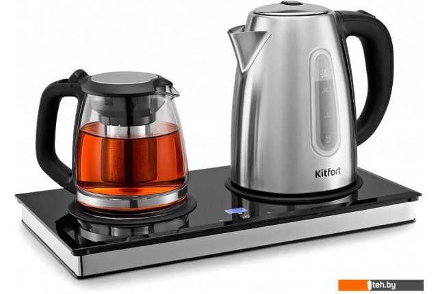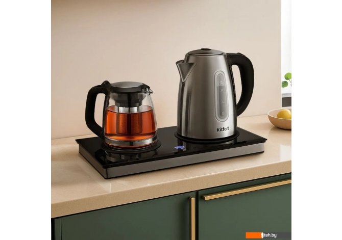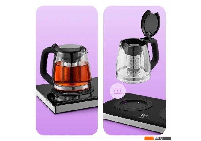 | Информация | Идеальный чай каждый раз Стильный и функциональный чайный набор КТ-6778 состоит из чайника ёмкостью 1,8 л, заварочного чайника с фильтром для заварки на 1,2 л и базы. Набор идеально подойдёт для кипячения воды и поддержания температуры напитка за счёт платформы с подогревом. Сенсорное управление Кнопка «Подогрев» включает и выключает платформу с подогревом. Во время её работы на дисплее отображается установленная температура нагрева. По умолчанию устройство нагревает воду до 80°C. База изготовлена из стеклокерамики, устойчивой к царапинам. Поддерживает заданную температуру С помощью сенсорного управления кнопками «Больше»/ «Меньше» можно установить температуру подогрева воды в заварочном чайнике от 60°C до 90°C с шагом 1°C. Время поддержания температуры составляет 24 часа. Для заварки чая и ягодных напитков Заварочный чайник ёмкостью 1,2 литра изготовлен из стекла и имеет съёмный фильтр для чая или кофе. В месте установки заварочного чайника на базу находится платформа с подогревом, благодаря которой напиток и остаётся тёплым. Продуманные детали Корпус и крышка чайника выполнены из пластика и нержавеющей стали. Переключатель расположен на ручке. Удобная пластиковая ручка не нагревается. Мерная шкала с отметками нанесена на прозрачную часть корпуса. При включении загорается индикатор. Для безопасного использования Чайник оснащён защитой от перегрева и включения без воды. Центральный контакт позволяет устанавливать его на подставку в любом положении на 360°. Полный чайник закипает примерно за 6 минут. Компактные размеры Небольшие габариты чайной станции позволяют расположить её практически в любое удобное место. Наслаждайтесь чаепитием вместе с чайным набором КТ-6778! |