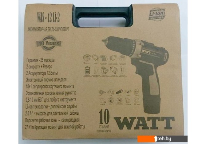 Фотографии, описание и технические характеристики модели электродрели WATT WAS-12 Li-2 101202712 (с 2мя АКБ) взяты из открытых источников, официального сайта производителя или представительства WATT в Республике Беларусь.