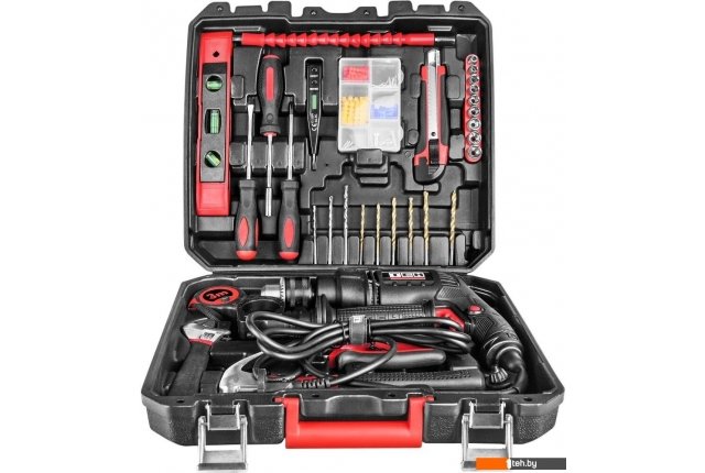 | Комплектация | - Дрель ударная; - Дополнительная рукоятка; - Ограничитель глубины сверления; - Ключ для патрона; - Комплект запасных угольных щеток; - Набор оснастки и ручного инструмента; - Руководство по эксплуатации; - Пластиковый кейс. |