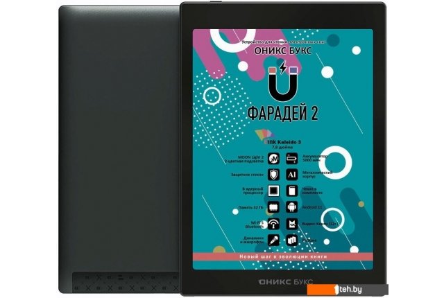 | Информация | ОНИКС БУКС Фарадей 2 — ридер с 7,8-дюймовым цветным экраном E Ink Kaleido 3 с подсветкой и сенсорным управлением. Модель базируется на современном 8-ядерном процессоре и имеет 3 ГБ оперативной памяти. Устройство работает под управлением операционной системы Android 11 и позволяет устанавливать и использовать сторонние приложения. На ридере предустановлен магазин RuStore, в каталоге которого представлено более 40 тысяч программ. На устройстве установлено множество полезных приложений, включая онлайн библиотеку Яндекс Книги (12+). Благодаря встроенному аудиоплееру можно прослушивать музыку и аудиокниги, а наличие функции TTS позволяет озвучивать текстовые файлы. Модуль Wi-Fi дает возможность использовать сетевые сервисы, а поддержка Bluetooth — подключать внешние устройства. Модель выполнена в тонком металлическом корпусе, экран дополнительно закрыт защитным стеклом ONYX Glass. В комплекте с ридером поставляется стильный защитный чехол. Благодаря увеличенному экрану и способности отображать цвета модель станет отличным выбором для тех, кто планирует совмещать чтение книг и комиксов с работой с документами, имеющими цветные изображения. |