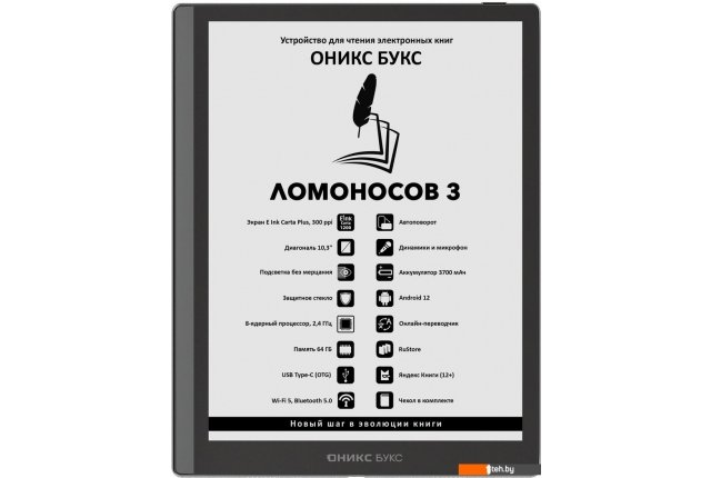 | Информация | - ОНИКС БУКС Ломоносов 3 — это крупноформатный ридер с 10,3-дюймовым дисплеем E Ink Carta Plus (Carta 1200) высокого разрешения, оснащённым подсветкой и сенсорным управлением для комфортного чтения в любых условиях. - Устройство работает на современной аппаратной платформе под управлением Android 12, что даёт возможность устанавливать сторонние приложения. В системе уже предустановлен магазин RuStore с доступом к более чем 40 тысячам программ. - Ридер поддерживает воспроизведение музыки и аудиокниг благодаря встроенному аудиоплееру, а функция преобразования текста в речь (TTS) позволяет прослушивать текстовые файлы. - Подключение к интернету осуществляется через Wi-Fi, а модуль Bluetooth позволяет использовать внешние аксессуары, такие как наушники или клавиатура. - Корпус устройства выполнен в тонком и лёгком формате, экран защищён прочным стеклом ONYX Glass. В комплект входит стильный защитный чехол, обеспечивающий дополнительную защиту. - ОНИКС БУКС Ломоносов 3 станет отличным выбором для тех, кто хочет совмещать чтение электронных книг с работой над документами и мультимедийными возможностями. |