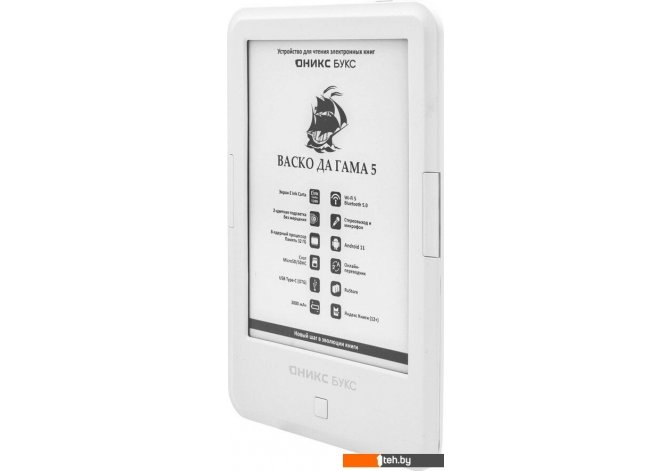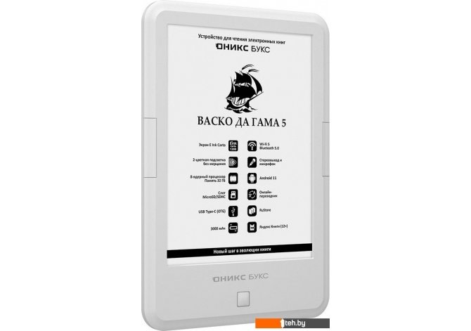 | Информация | - ОНИКС БУКС Васко Да Гама 5 — 6-дюймовое устройство для чтения электронных книг с дисплеем E Ink Carta (Carta 1200) с подсветкой и сенсорным управлением. - Модель выполнена в классическом корпусе с удобными кнопками управления и оснащена 8-ядерным процессором и 2 ГБ оперативной памяти. 32 ГБ встроенной памяти в сочетании со слотом micro SD позволяют хранить большое количество книг и документов непосредственно на устройстве. - Модель имеет двухдиапазонный модуль Wi-Fi, позволяющий использовать различные сетевые сервисы. Поддержка Bluetooth дает возможность подключать беспроводные устройства, такие как наушники или колонки. Благодаря операционной системе Android 11 можно устанавливать на ридер различные сторонние программы. - Имеется предустановленный магазин приложений RuStore, с помощью которого можно скачивать, покупать и обновлять приложения. Встроенный аудиоплеер позволяет прослушивать аудиокниги и музыку, а функция TTS - озвучивать текстовые файлы. - |