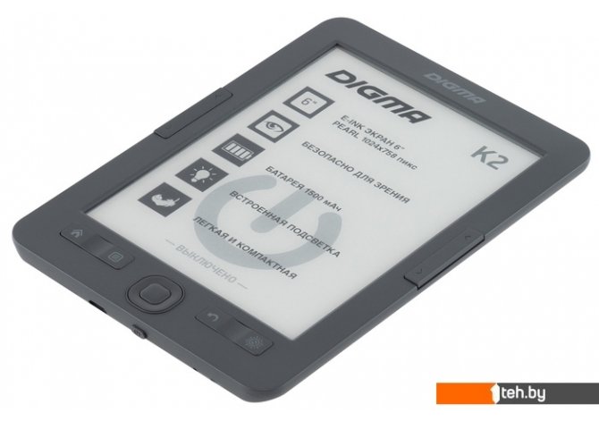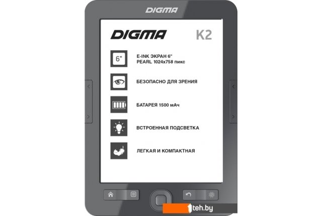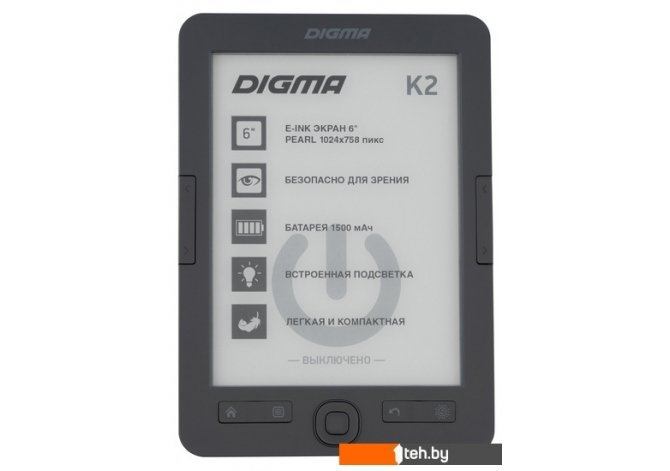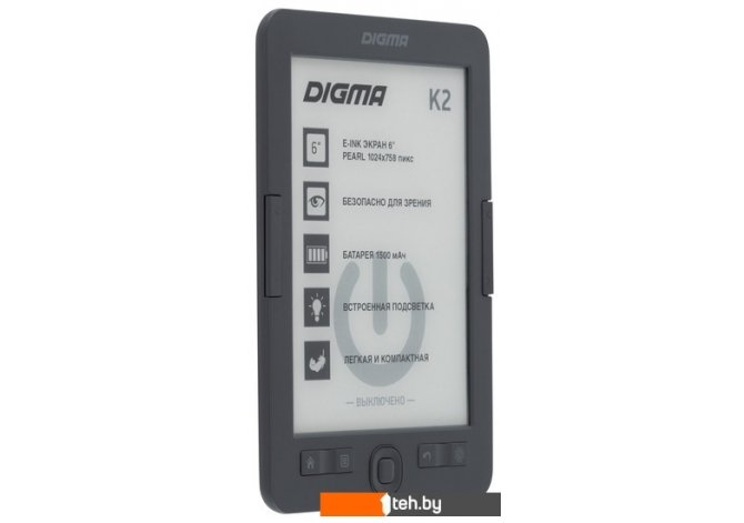 Фотографии, описание и технические характеристики модели электронной книги Digma K2 взяты из открытых источников, официального сайта производителя или представительства Digma в Республике Беларусь.