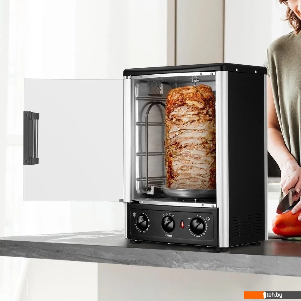 Информация | - В комплект шашлычницы КТ-1409 входят 7 боковых шампуров и 1 вертел. Вы сможете готовить не только шашлык и мясо, но и рыбу, овощи, а также шаверму, люля и сардельки. Кроме того, можно запечь кукурузу на гриле, картошку и гренки! За один раз вы сможете приготовить до 4,5 килограммов еды. - Для запекания предусмотрены 2 режима работы: «Верхний нагрев» подходит для небольших порций или продуктов, не требующих сильного запекания, а режим «Верхний и нижний нагрев» идеально подходит для больших блюд и полного запекания. - Вы также можете приготовить домашнюю шаверму! Мясо насаживается на центральный вертел и вращается между нагревательными элементами. Готовое мясо легко срезать и использовать для шавермы и других блюд. - Модель КТ-1409 компактна и не займет много места на вашей кухне благодаря вертикальному дизайну, который гармонично впишется в любой интерьер! - В комплект входят 7 шампуров для шашлыка, сосисок и овощей, а также центральный вертел для шавермы и курицы на гриле. Кроме того, в набор входят 2 решетки и 1 противень, что позволяет использовать шашлычницу как ростер. - Регулятор температуры позволяет установить нагрев до 240°C, а таймер — до 60 минут. Для приготовления без установки таймера просто поверните регулятор против часовой стрелки до упора. - Под шампурами находится специальная тарелочка для сбора сока и жира, которую легко снять и очистить после приготовления шашлыка. |