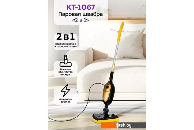 | Информация | Паровая швабра КТ-1067 — универсальное устройство, которое поможет избавиться от пыли и грязи с помощью мощной струи пара, а также продезинфицирует обрабатываемую поверхность. Уборку паровой шваброй можно проводить без чистящих средств. Конструкция «2 в 1» предусматривает наличие ручного модуля паровой швабры, который удобно использовать с насадками. С помощью насадок можно очистить большинство вещей в доме. При помощи специальных насадок из комплекта КТ-1067 вы можете очистить напольные покрытия, раковину и плиту на кухне, зеркала, окна и плитку в ванной без каких-либо химических средств, исключительно паром. Плоская нейлоновая щётка удобна для уборки радиаторных батарей и решётчатых поверхностей, а струйная для чистки щелей и углов. Скребок подойдёт для очистки окон, зеркал и кафельной плитки. Латунная щётка поможет справиться со стойкими загрязнениями. Принцип действия паровой швабры основан на воздействии горячего пара на загрязнения. Пар проникает внутрь загрязнения, размягчая и растворяя его, а затем с помощью тряпки частички грязи смываются. Высокая температура пара способствует процессу очистки. Устройство обладает большим углом наклона при уборке, который поможет легко убирать пространство под мебелью. Напольная насадка закреплена на специальном шаровом шарнире с наклоном в двух плоскостях, что делает швабру очень манёвренной и облегчает уборку. Устройство оснащено резервуаром для воды ёмкостью 300 мл, что позволяет производить непрерывную уборку 8-10 минут. Для удобного наливания воды в комплекте предусмотрен мерный стакан. В комплекте предусмотрено множество насадок для различного использования. Также к паровой швабре будут идти мерный стакан, воронка, тряпки для пола и рамка для ковра. У паровой швабры предусмотрены держатели для шнура с обратной стороны прибора. Это способствует комфортному и компактному хранению устройства в домашних условиях. |