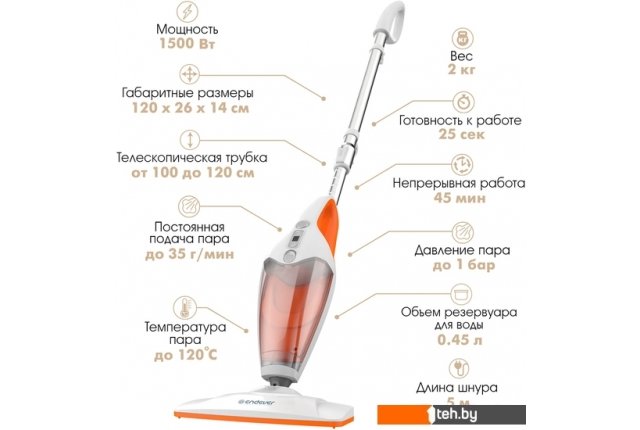 | Информация | Все мы с Вами знаем, что чистота – это залог здоровья и только в чистом доме присутствует гармония и уют. Для поддержания чистоты в доме мы используем всевозможные бытовые приборы и порой их скапливается очень много в подсобках Ваших домов и девать становится некуда. Решением проблемы по оптимизации количества бытовой техники и объединению функций от разных бытовых приборов является паровая швабра «2 в 1» ENDEVER ODYSSEY Q-622, которая с легкостью трансформируется в компактный ручной отпариватель. А большой комплект дополнительных насадок расширить возможности по вариантам обработки различных поверхностей, таких как ламинированные деревянные поверхности, натуральный или искусственный камень, керамика, линолеум, керамическая плитка, металлические поверхности, стекольные окна, зеркала. Помимо всего прочего, при помощи специальной насадки для одежды Вы сможете еще и отпаривать, и одежду. За короткое время до 25 секунд паровая швабра ENDEVER ODYSSEY Q-622 будет готова к работе и способна проработать до 45 минут без долива воды. Съемный бак для воды рассчитан на 450 мл. За счет высокой мощности достигается хороший показатель степени подачи пара до 35 г/мин. Для удобства есть возможность регулировки степени подачи пара. Помимо непосредственно очистки обрабатываемой поверхности, паровая швабра ENDEVER ODYSSEY Q-622 дополнительно дезинфицирует ее при помощи высокой температуры пара до 120 градусов, уничтожая до 99,9% вредоносных бактерий и микроорганизмов. Дополнительно для безопасной работы в паровой швабре ENDEVER ODYSSEY Q-622 предусмотрены функция защиты от протечки воды и функция защиты от перегрева. Гарантийный срок составляет целых 18 месяцев, в течении которых вы можете абсолютно не волноваться за работоспособность изделия. |