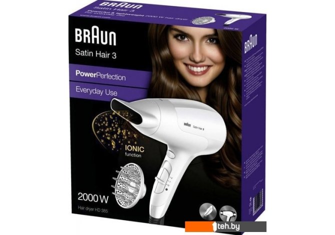 Фотографии, описание и технические характеристики модели фена Braun HD 385 взяты из открытых источников, официального сайта производителя или представительства Braun в Республике Беларусь.