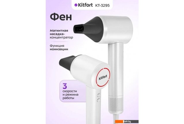 Фотографии, описание и технические характеристики модели фена Kitfort KT-3295 взяты из открытых источников, официального сайта производителя или представительства Kitfort в Республике Беларусь.