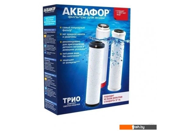 Описание фильтра | Включает модули, необходимые для полного цикла очистки:1) предварительная сорбционная очистка питьевой воды (В510-03);2) глубокая сорбционная доочистка питьевой воды с умягчением (В510-04);3) финишная сорбционная очистка и кондиционирование питьевой воды (В510-07). Используется в стационарных системах очистки питьевой воды АКВАФОР Трио, а также в системах других марок, использующих 10" стандарт корпуса. |