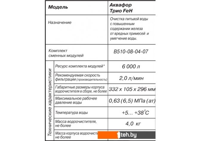 Если хотите купить фильтр для воды АКВАФОР Трио Fe H то следует уточнить все параметры и габариты модели перед покупкой. Представленые характеристики на сайте 1teh.by могут отличаться от действительных или указанных производителем. Описание, фото товара и технические характеристики представлены для справки.