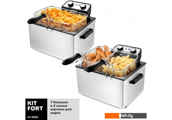 | Информация | Kitfort KT-2025 укомплектована тремя корзинами для жарки — одной большой и двумя маленькими. Малые корзины вы можете устанавливать во фритюрницу одновременно. Это удобно, если вы хотите приготовить два различных блюда. |