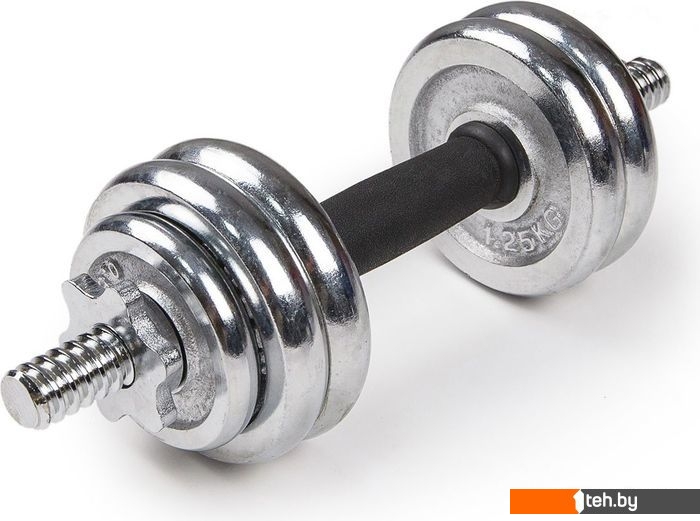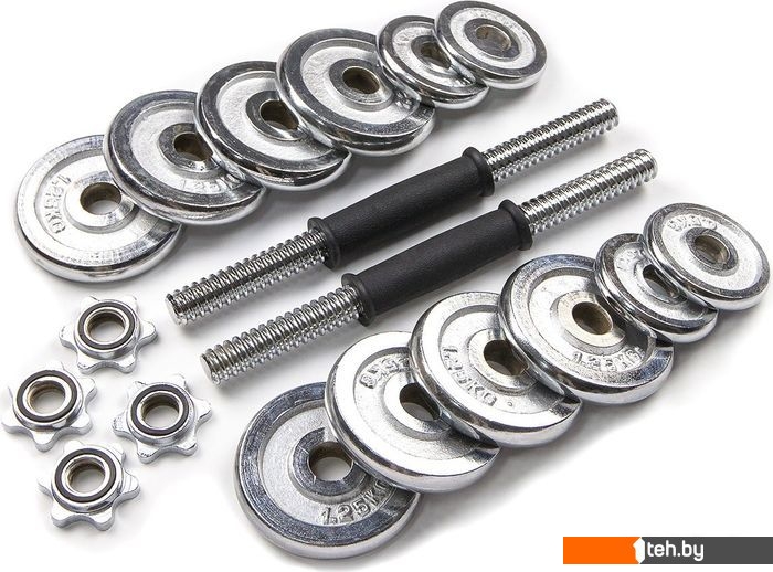 Комплектация | - 2 грифа диаметром 26 мм, длиной 35 см (длина резьбы 11 см с каждой стороны) и весом 1,35 кг - 4 зажима, которые обеспечивают точные нагрузки давления - 4 диска х 0,5 кг (диаметр 9,5 см, ширина 1,4 см) - 8 диска х 1,25 кг (диаметр 11 см, ширина 1,8 см) |