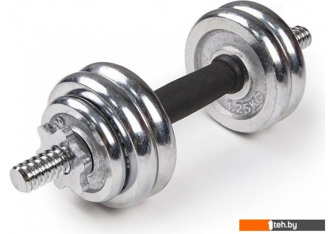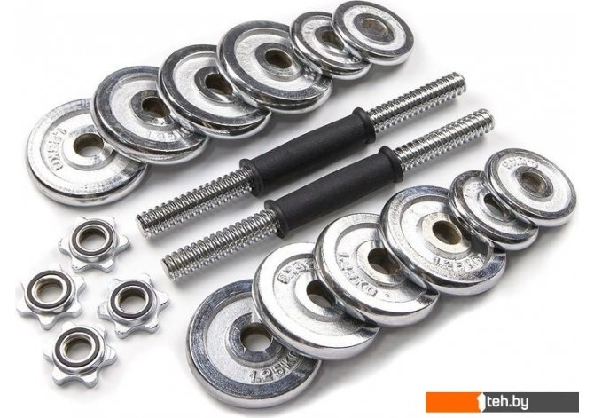 | Комплектация | - 2 грифа диаметром 26 мм, длиной 35 см (длина резьбы 11 см с каждой стороны) и весом 1,35 кг - 4 зажима, которые обеспечивают точные нагрузки давления - 4 диска х 0,5 кг (диаметр 9,5 см, ширина 1,4 см) - 8 диска х 1,25 кг (диаметр 11 см, ширина 1,8 см) |