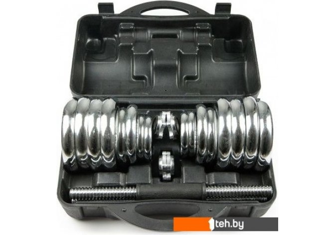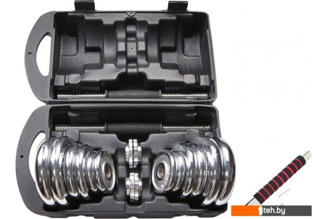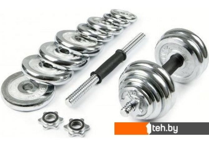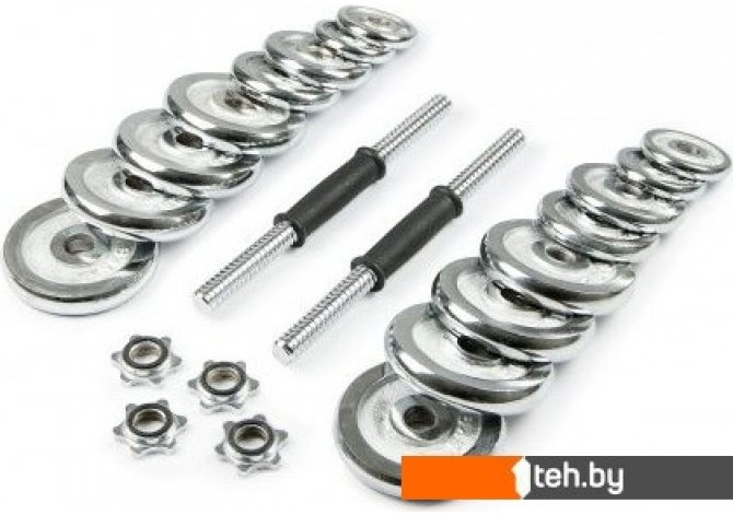 | Комплектация | - 2 грифа диаметром 26 мм, длиной 35 см (длина резьбы 11 см с каждой стороны) и весом 1,35 кг - 4 зажима, которые обеспечивают точные нагрузки давления - 4 диска х 0,5 кг (диаметр 9,5 см, ширина 1,4 см) - 4 диска х 1,25 кг (диаметр 11 см, ширина 1,8 см) - 4 диска х 2,5 кг (диаметр 15 см, ширина 2,2 см) - 1 соединительный гриф |