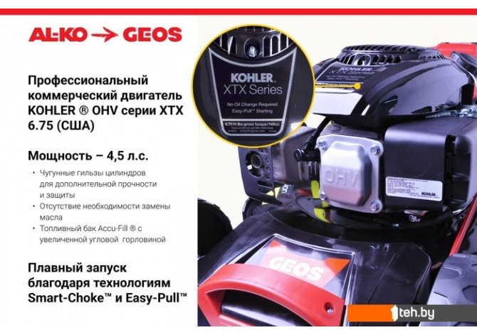 | Информация | ? Газонокосилка бензиновая Geos Classic 46 SP-K Plus 213142 идеально подходит для кошения участков до 1400 кв.м. с мощным американским двигателем KOHLER. ? Плавный запуск двигателя благодаря технологиям Smart-Choke и Easy-Pull. ?? Легкая заправка благодаря топливному баку Accu-Fill с увеличенной угловой горловиной. ? Больше не нужно менять масло: просто проверяйте уровень масла перед каждым использованием. |