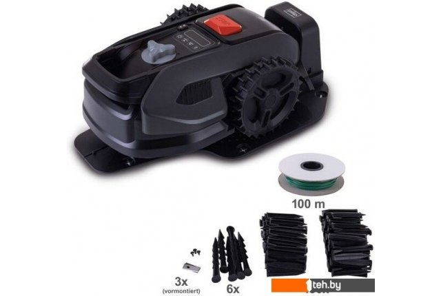 | Комплектация | - зарядная станция 0,6 А с 6 монтажными колышками, - провод по периметру 100 м, - 130 монтажных колышков |