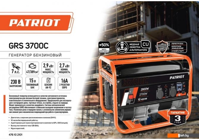 Фотографии, описание и технические характеристики модели генератора Patriot GRS 3700C взяты из открытых источников, официального сайта производителя или представительства Patriot в Республике Беларусь.