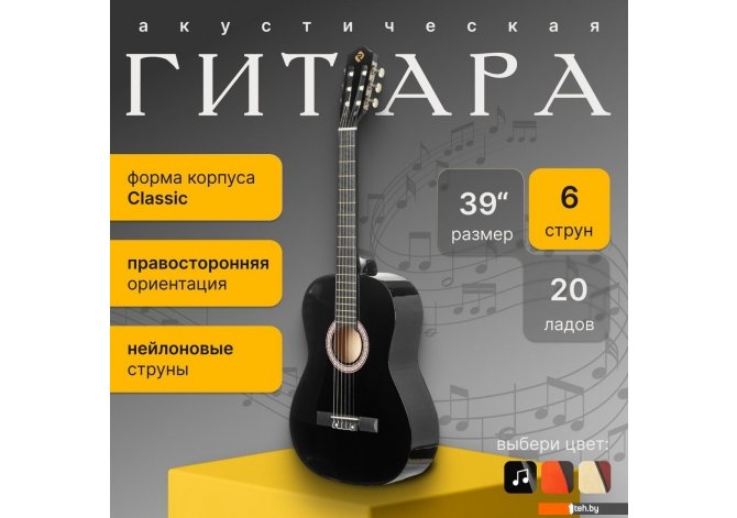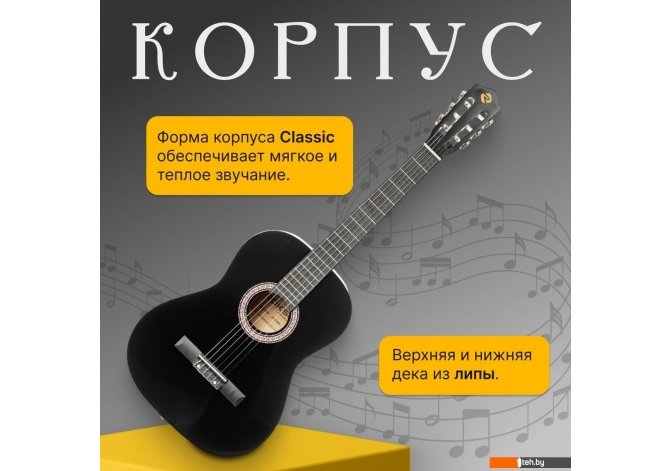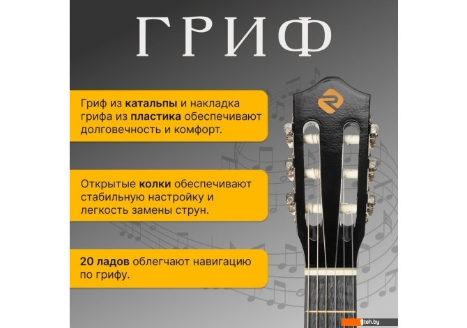 | Информация | - Акустическая гитара ROKSO FT-C-B39 - это инструмент, сочетающий классический дизайн и современные материалы, что делает его отличным выбором для музыкантов разного уровня. - Корпус гитары выполнен из легкой и прочной липы. Форма classic обеспечивает мягкое и теплое звучание, подходящее для различных жанров музыки. - Шесть нейлоновых синтетических струн обеспечивают мягкое и комфортное звучание, а гриф из катальпы в сочетании с пластиковой накладкой гарантирует долговечность и удобство при игре. На грифе расположено 20 ладов, что упрощает навигацию и расширяет возможности исполнения. - Открытые колки позволяют быстро и стабильно настраивать инструмент, а классическая конструкция без катавея делает гитару идеальной для освоения базовых техник и для регулярных занятий. |