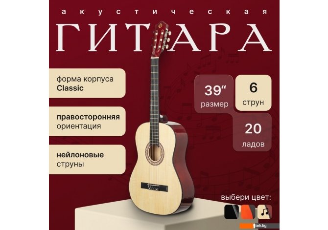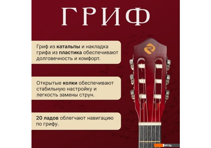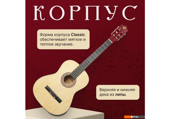 | Информация | - Акустическая гитара ROKSO FT-C-B39 - это инструмент, сочетающий классический дизайн и современные материалы, что делает его отличным выбором для музыкантов разного уровня. - Корпус гитары выполнен из легкой и прочной липы. Форма classic обеспечивает мягкое и теплое звучание, подходящее для различных жанров музыки. - Шесть нейлоновых синтетических струн обеспечивают мягкое и комфортное звучание, а гриф из катальпы в сочетании с пластиковой накладкой гарантирует долговечность и удобство при игре. На грифе расположено 20 ладов, что упрощает навигацию и расширяет возможности исполнения. - Открытые колки позволяют быстро и стабильно настраивать инструмент, а классическая конструкция без катавея делает гитару идеальной для освоения базовых техник и для регулярных занятий. |