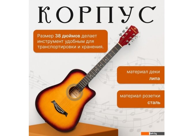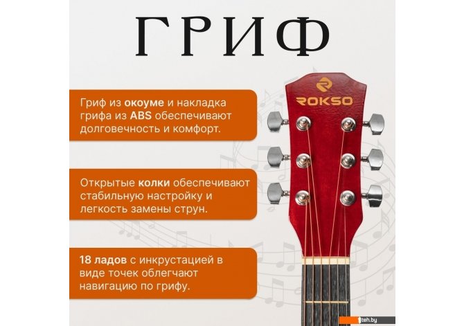 | Информация | - Акустическая гитара ROKSO FT-D38 - это универсальный инструмент с классическим корпусом dreadnought, обеспечивающим мощное и насыщенное звучание, подходящее для различных музыкальных стилей. Гитара оснащена шестью металлическими струнами с бронзовой обмоткой, что придает звуку яркость и четкость, а длина мензуры 24.8 дюйма делает игру комфортной и способствует точной настройке. - Корпус инструмента выполнен из липы, что обеспечивает легкость и долговечность конструкции, а гриф изготовлен из окоуме с накладкой из ABS, что гарантирует дополнительную прочность и комфорт при игре. 18 ладов с инкрустацией точками позволяют легко ориентироваться по грифу, а закрытые колки обеспечивают стабильную настройку. - Эта модель отлично подойдет как начинающим, так и опытным музыкантам, которые ценят сочетание надежности, эргономики и привлекательного дизайна. ROKSO FT-D38 - оптимальный выбор для тех, кто ищет качественную акустическую гитару по доступной цене. |