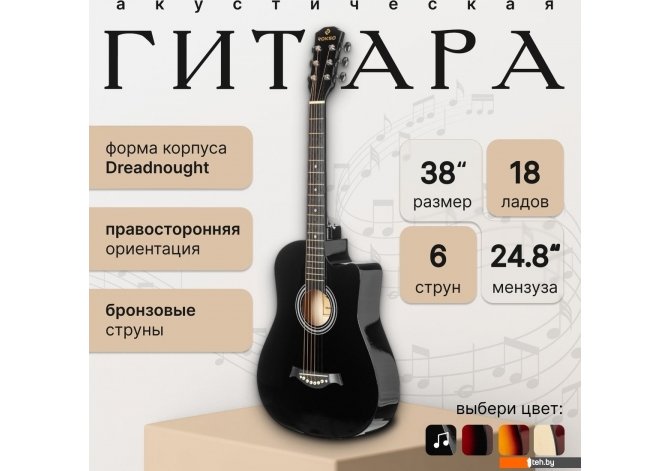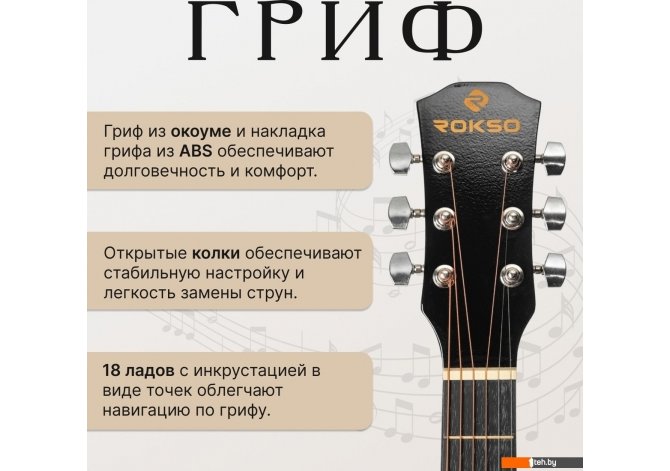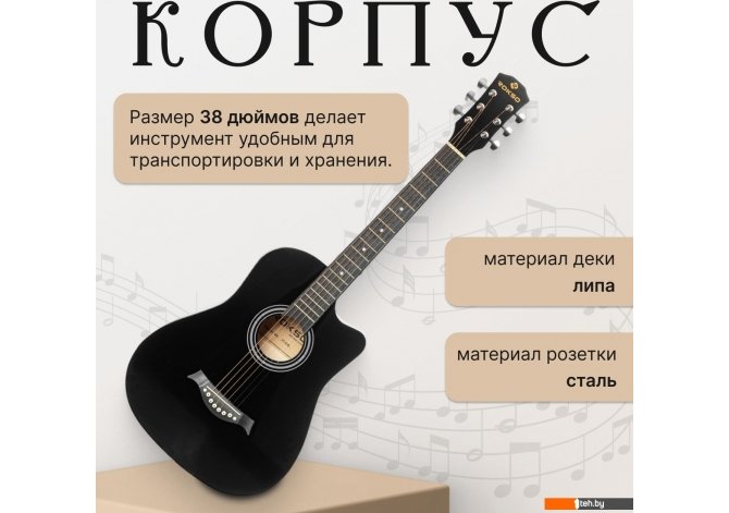 | Информация | - Акустическая гитара ROKSO FT-D38 - это универсальный инструмент с классическим корпусом dreadnought, обеспечивающим мощное и насыщенное звучание, подходящее для различных музыкальных стилей. Гитара оснащена шестью металлическими струнами с бронзовой обмоткой, что придает звуку яркость и четкость, а длина мензуры 24.8 дюйма делает игру комфортной и способствует точной настройке. - Корпус инструмента выполнен из липы, что обеспечивает легкость и долговечность конструкции, а гриф изготовлен из окоуме с накладкой из ABS, что гарантирует дополнительную прочность и комфорт при игре. 18 ладов с инкрустацией точками позволяют легко ориентироваться по грифу, а закрытые колки обеспечивают стабильную настройку. - Эта модель отлично подойдет как начинающим, так и опытным музыкантам, которые ценят сочетание надежности, эргономики и привлекательного дизайна. ROKSO FT-D38 - оптимальный выбор для тех, кто ищет качественную акустическую гитару по доступной цене. |