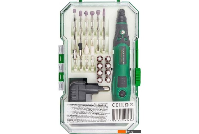 | Комплектация | Шлифовальные принадлежности шлифлента (8 шт.), шлифовальный камень (6 шт.) Принадлежности гравера держатель, алмазный наконечник (6 шт.), полировальный круг (2 шт.) Дополнительная комплектация зарядное устройство, кейс |