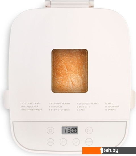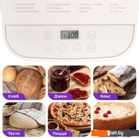 Перечень режимов работы | кекс, безглютеновая выпечка, французский хлеб, сдоба, классический хлеб, быстрая выпечка, цельнозерновой хлеб, замес теста, экспресс, джем, тостовый хлеб, запекание |