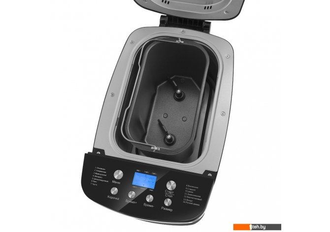| Перечень режимов работы | 1. Основная 2. Ускоренная 3. Французский 4. Экспресс 5. Цельнозерновой 6. Кекс 7. Тесто 8. Выпекание 9. Сладкий 10. Джем 11. Замешивание 12. Безглютеновый 13. Йогурт 14. Ручной режим |