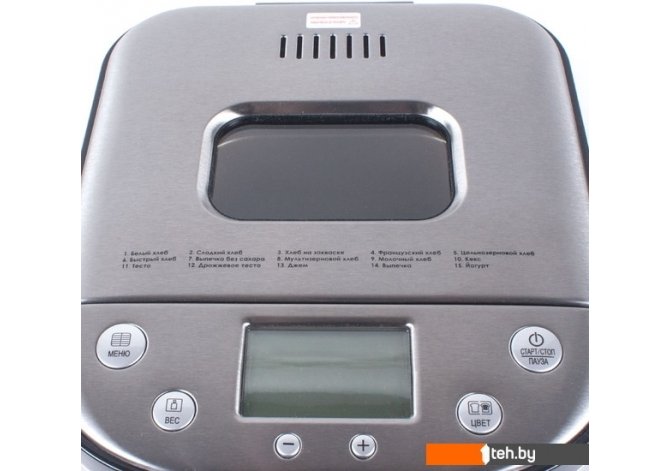 | Основные программы | французский багет, кекс, сладкая выпечка, варенье, йогурт, белый хлеб, замес теста, цельнозерновой хлеб |