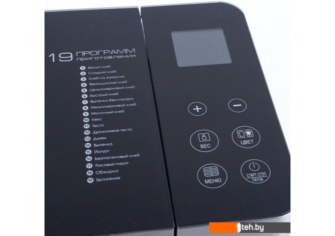 | Основные программы | безглютеновая выпечка, белый хлеб, варенье, кекс, сладкая выпечка, французский багет, цельнозерновой хлеб |