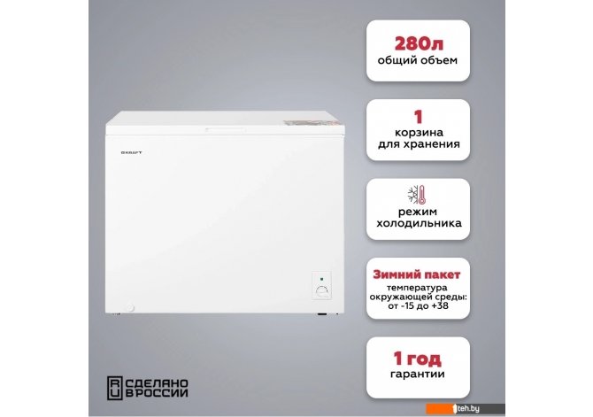 | Информация | - Морозильный ларь Kraft BD (W)-280RX станет отличным приобретением для квартиры, дома, отеля, офиса, либо промышленного помещения. - Устройство позволяет хранить большой объем продуктов питания длительное время. - Благодаря лаконичной белой расцветке корпуса модель дополнит собой любой интерьер. - Общий объем морозильного ларя достигает 280 л. - Устройство имеет высокий класс энергоэффективности – А+. - Для комфортного хранения продуктов в камере предусмотрена подвесная корзина. - Мощность замораживания модели составляет 11,5 кг/сутки. - Работа прибора сопровождается низким уровнем шума, не превышающим 41 дБ. |