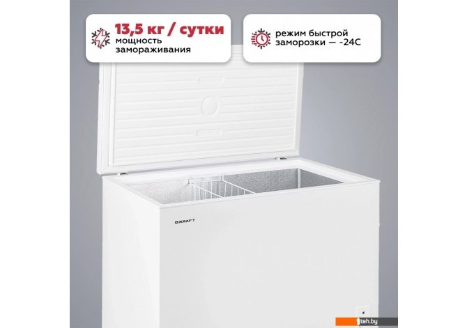 | Информация | - Морозильный ларь Kraft BD (W)-340RX станет отличным приобретением для квартиры, дома, отеля, офиса, либо промышленного помещения. Общий объем морозильного ларя достигает 340 л. Устройство имеет высокий класс энергоэффективности – А+. Для комфортного хранения продуктов в камере предусмотрена подвесная корзина. Мощность замораживания модели составляет 13,5 кг/сутки. Работа прибора сопровождается низким уровнем шума, не превышающим 41 дБ. - Благодаря опции «Зимний пакет» морозильные лари серии RX можно ставить в помещения с широким диапазоном температур – от -15 до +43 градусов. Данная опция позволяет эксплуатировать ларь при отрицательных температурах (в неотапливаемом гараже, на балконе, в подвале), так и при высоких температурах южных регионов. - Режим холодильника расширяет возможности использования ларя, например, для охлаждения напитков в жаркие летние дни. Корпус ларя сделан всего из двух листов металла, что уменьшает количество стыковочных швов и обеспечивает лучшее удержание холода, а также существенно уменьшает вероятность образования коррозии. - Качественная долговечная резинка из современных материалов не теряет своей эластичности со временем, продолжая плотно прилегать к корпусу и крышке ларя, не допуская таким образом потерю холода. Охладительные трубки расположены внутри корпуса ларя, а также имеют уникальное D-образное сечение, что обеспечивает более эффективное и равномерное охлаждение внутри морозильного ларя. - |