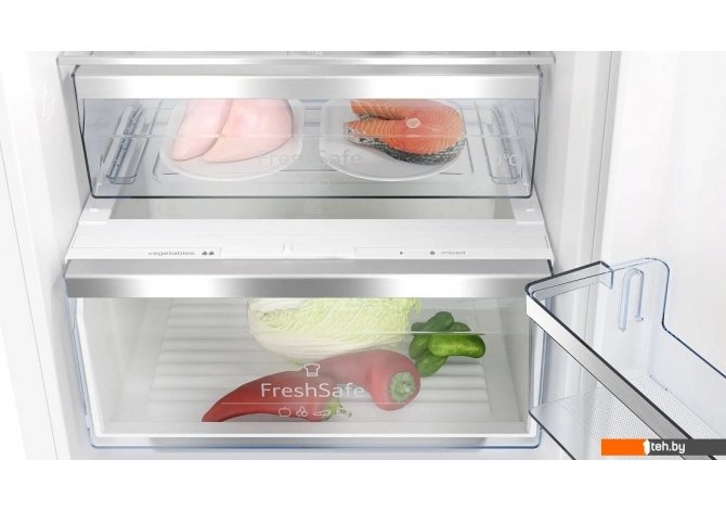 Информация | - Данная модель холодильника выполнена в классическом белом цвете, что делает его идеальным дополнением для любой кухни. Без ручки, с сенсорным управлением TouchControl и цифровым дисплеем, он выглядит современно и стильно. Освещение в холодильной камере использует технологию LED, обеспечивая яркое и равномерное освещение без перегрева. - Общий полезный объем составляет 260 литров, из которых 184 литра предназначены для холодильного отделения, а 76 литров — для морозильного. В холодильном отделении есть три полки из ударопрочного стекла, одна из которых регулируется по высоте, что позволяет удобно организовать пространство для хранения продуктов. Также предусмотрены две полки на двери и два ящика для овощей и фруктов. - Особенностью этой модели является система охлаждения NoFrost, предотвращающая образование инея в обоих отделениях, а также автоматическая система размораживания. Это значительно упрощает уход за прибором и помогает сохранять продукты свежими на долгое время. Кроме того, холодильник оснащен функцией суперохлаждения, а морозильник — функцией суперзамораживания FastFreeze. - Зона свежести FreshSafe с уровнем влажности 50% позволяет долго сохранять продукты свежими. В морозильном отделении предусмотрены три ящика и ванночка для льда. - Прибор работает от одного компрессора и имеет две камеры с возможностью перенавешивания дверей. Класс энергопотребления A+++ свидетельствует о его высокой энергоэффективности. Уровень шума составляет всего 35 дБ, что делает его практически незаметным на фоне обычного бытового шума. - При отключении электроэнергии продукты в холодильнике сохраняют свою свежесть в течение 11 часов. Дверь мягко закрывается при достижении угла в 20° благодаря доводчику Softclose. Также предусмотрена акустическая сигнализация открытой дверцы и неисправностей. |