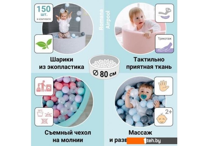 | Информация | Сухой бассейн — это простая и веселая забава для малышей. Используйте его как отдельную игровую зону или манеж. Также сухой бассейн наполняется шариками для подвижных игр и отдыха. Он мягкий и безопасный, быстро и просто чистится от грязи влаги. Однотонный бирюзовый сухой бассейн хорошо подойдет для интерьера детской комнаты. Также он отлично смотрится в соответствующем дизайне игрового или учебного центра. Купите сухой бассейн ROMANA Airpool — безопасное игровое пространство для детей! |
