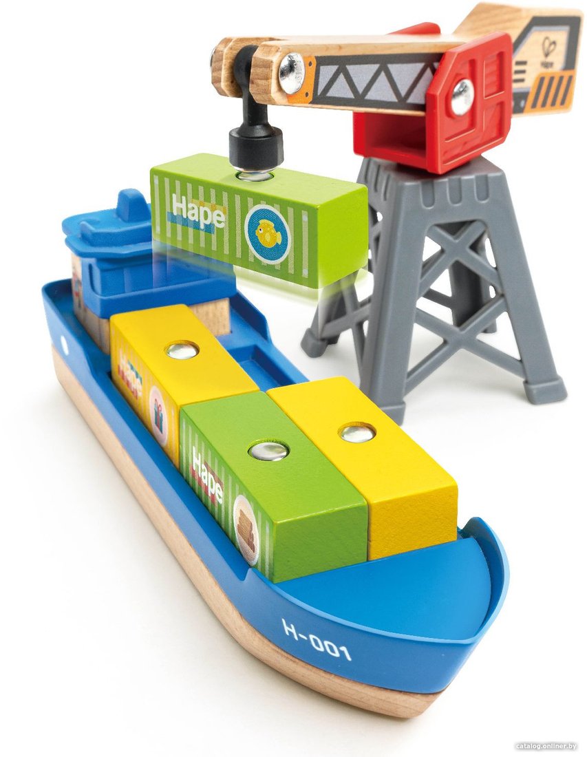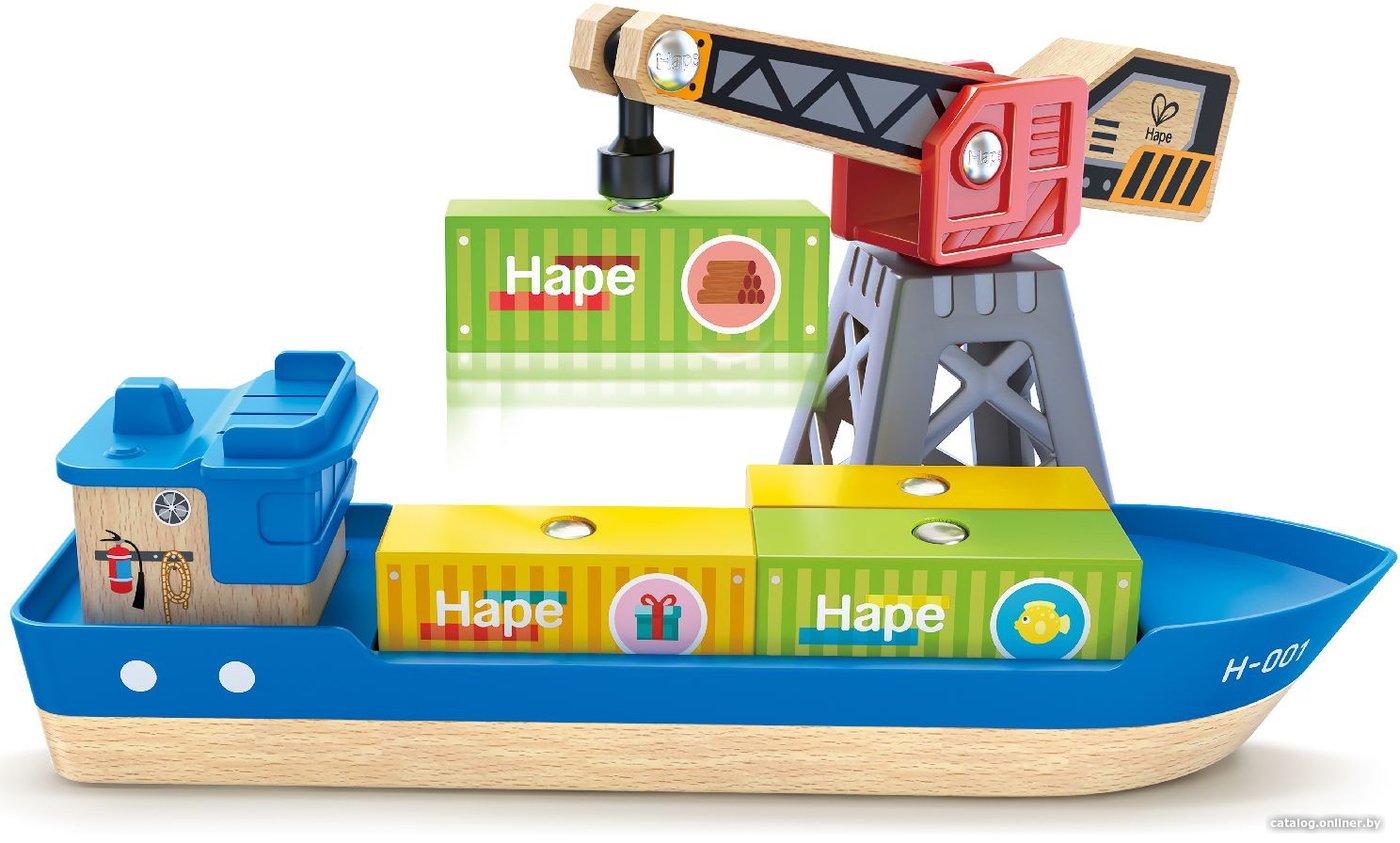 Информация | - Набор Hape Грузовой корабль и подъемный кран представляет собой игровой набор, который включает в себя портовый подъемный кран с магнитом, 4 грузовых контейнера и большой корабль для перевозки грузов. - С помощью подъемного крана можно легко перемещать контейнеры с корабля на сушу и обратно. |