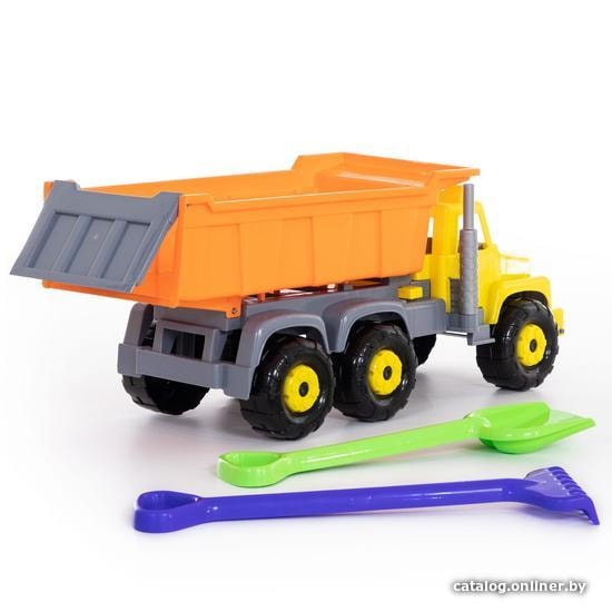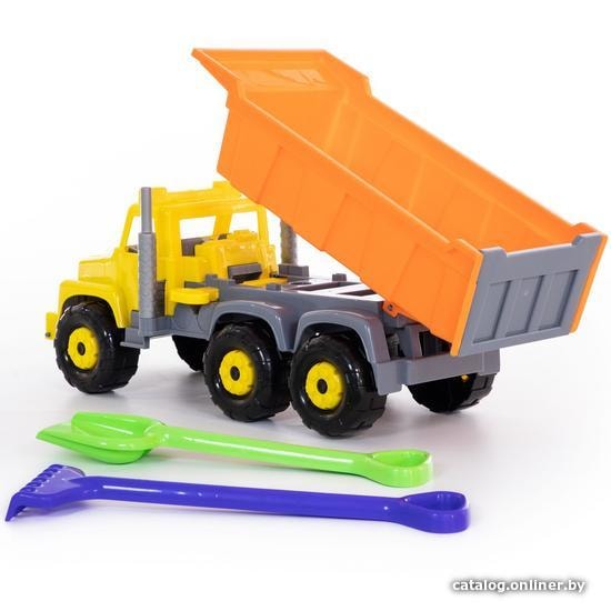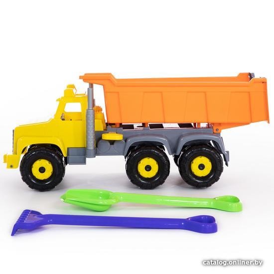 Игрушечный транспорт Полесье Супергигант автомобиль-самосвал + лопата и грабли 5557