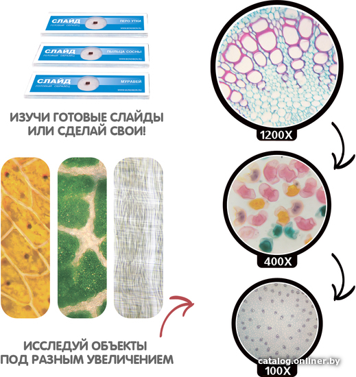 Информация | Что скрывается от наших глаз? Узнайте это вместе с Микроскопом Bondibon с увеличением 100Х, 400Х, 1200Х и отличным качеством изображения! С таким точным инструментом из серии "Французские Опыты" Науки с Буки ребенок будет с удовольствием изучать природные явления. Возьмите образец – из набора (перо утки, пыльца сосны, муравей) или сделайте сами, закрепите в микроскопе, настройте увеличитель и свет. Микроскоп имеет две встроенные подсветки: верхнюю используйте для изучения непрозрачных и 3д объектов, нижнюю - для подсветки слайдов. Используйте цветные фильтры, чтобы картинка стала четче. Окуляр микроскопа можно повернуть на 360 градусов, что очень удобно для двоих наблюдателей. |