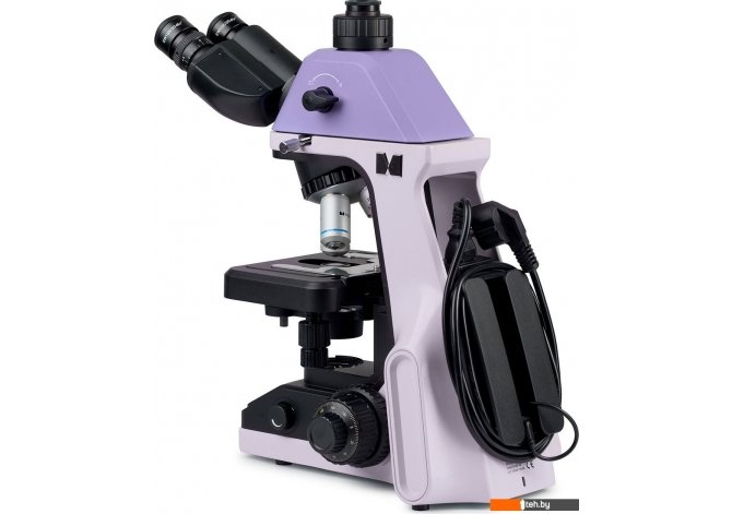 | Информация | - MAGUS Bio 240T – это идеальный студенческий биологический микроскоп, предназначенный для работы в светлом поле и исследования в проходящем свете. Он оснащен кодированным револьвером, который запоминает настройки освещения для каждого объектива, а также встроенным ЖК-монитором для отображения выбранных параметров и тринокулярной визуальной насадкой с отдельным тубусом для цифровой камеры. - Визуальная насадка позволяет устанавливать два окуляра и цифровую камеру, а световой поток можно разделить на 100/0 или 0/100. В комплект входят два окуляра 10х/20 мм, а оптика рассчитана на бесконечность. Для удобства пользователей в очках окуляры комплектуются плоскими наглазниками, которые защищают оптику от повреждений. Также предусмотрена возможность коррекции резкости изображения для людей с близорукостью и дальнозоркостью. - Револьвер имеет 4 гнезда под объективы и расположен так, что рабочий объектив находится перед пользователем, создавая свободное пространство. Кодированный револьвер автоматически настраивает яркость освещения для каждого объектива, что позволяет избежать усталости глаз и экономит время на подстройку освещения. - Фокусировка осуществляется с помощью коаксиально расположенных ручек с грубой и тонкой настройкой. Микроскоп также оснащен рукояткой блокировки грубой фокусировки и кольцом настройки жесткости хода, что обеспечивает комфорт при работе. - Предметный столик не имеет выдвижной зубчатой рейки по оси X, а препарат перемещается плавно благодаря механизму на ременной передаче. Препаратодержатель легко демонтируется при необходимости. - Под столиком установлен конденсор Аббе, который зафиксирован по высоте и отцентрирован, что исключает случайные смещения. Регулировка апертурной диафрагмы осуществляется с помощью цветных меток на кольце конденсора. - Для подсветки используется светодиод на 3 Ватта с возможностью выбора цветовой температуры от 3000 К до 7000 К. Светодиод рассчитан на 50 000 часов работы, а все настройки отображаются на встроенном экране. - Микроскоп имеет компактные размеры и легкий вес, что позволяет легко переносить его за ручки, встроенные в штатив. Провода и адаптер сети аккуратно спрятаны на задней стенке. - Основные особенности включают кодированный револьвер на 4 объектива, «умное» освещение, встроенный ЖК-дисплей, тринокулярную визуальную насадку и преднастроенный конденсор. - В комплект входят все необходимые элементы для работы, включая штатив, конденсор, объективы, окуляры, адаптер питания и пылезащитный чехол. Дополнительно можно заказать цифровую камеру, калибровочный слайд и монитор.  |