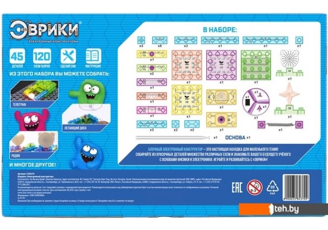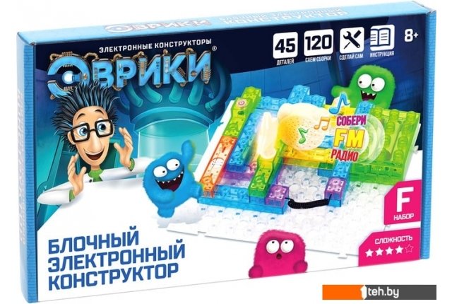 | Информация | Познакомьте ребёнка с удивительным миром науки — с блочным электронным конструктором торговой марки «Эврики» экспериментировать легко и интересно!Эта увлекательная игрушка не только порадует вашего маленького учёного, но и познакомит его с основами физики и электроники. В инструкции приведены 120 вариантов сборки, благодаря которым юный инженер узнает о принципах работы электричества и сможет самостоятельно собирать простые электрические схемы.Чтобы игрушка заработала, достаточно соединить между собой удобные детали-блоки. Детали конструктора совместимы с пластинами и фигурами LEGO Duplo, так что малыш сможет по своему желанию дополнять цепи и даже строить собственные!Схемы с лампочками и различными звуками, простой телеграф, FM-радио и многое другое! А управлять цепью можно с помощью как обычного выключателя, так и кнопочного, магнитного и даже сенсорной панели!Игра с таким конструктором поспособствует развитию у ребёнка логики, усидчивости и внимания, а также формированию навыка конструирования.В инструкции вы найдёте руководство для самостоятельной сборки новых цепей, а также познавательную информацию об электричестве. |