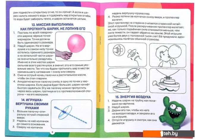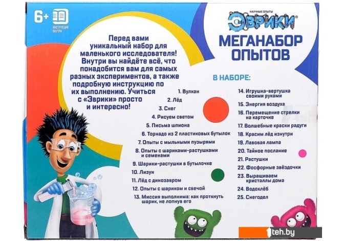| Информация | Если вы с ребёнком ещё не определились, какие опыты хотите провести — этот набор точно для вас. Внутри будет всё, что нужно для 25 разных опытов.Опыты, которые входят в набор:«Вулкан»«Лёд»«Снег»«Рисуем светом»«Письма шпиона»«Торнадо (из двух пластиковых бутылок)»«Опыт с мыльными пузырями»«Опыт с гидрогелем и семенами»«Гидрогель в бутылочке»«Лизун»«Лёд с динозавром»«Опыт с шариком и свечой»«Миссия невыполнима: как проткнуть шарик, не лопнув его»«Игрушка-вертушка своими руками»«Энергия воздуха»«Перемещение стрелки на карточке»«Волшебные краски радуги»«Красим лёд изнутри»«Лавовая лампа»«Тайное послание»«Растушки»«Фосфорные звёздочки»«Выращиваем кристаллы дома»«Водохлёб»«Снегодел»Как провести опыт — вам подскажет красочная инструкция внутри набора. |